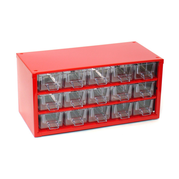 Kvalitné a odolné skrinky Tokoz, ktoré nesmú chýbať ani vo Vašej dielni, sú vyrobené z oceľového plechu a opatrené odolným práškovým lakom Číre zásuvky a prepážky sú vyrobené z trvanlivého materiálu PS 15 malých (S) zásuviek Šírka: 306 mm Výška: 147 mm Hĺbka rámu: 145 mm Hĺbka vrátane presahu zásuviek: 155 mm Farba: červená RAL 3002