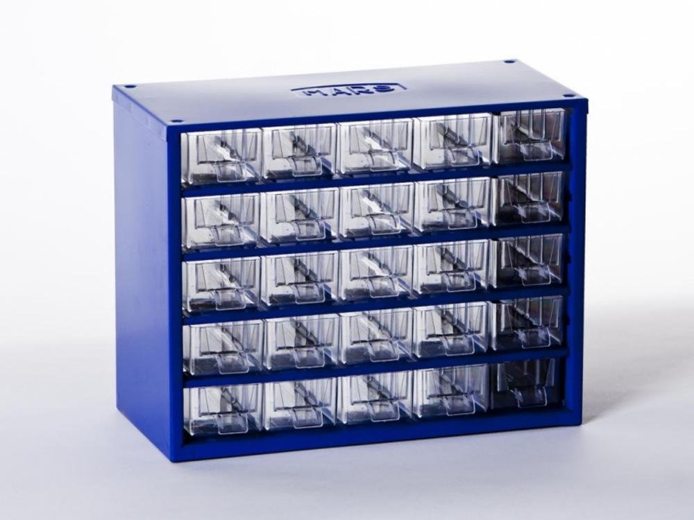 Kvalitné a odolné skrinky Mars, ktoré nesmú chýbať ani vo Vašej dielni, sú vyrobené z oceľového plechu a opatrené odolným práškovým lakom Číre zásuvky a prepážky sú vyrobené z trvanlivého materiálu PS (polystyrol) 25 malých zásuviek Šírka: 306 mm Výška: 238 mm Hĺbka rámu: 145 mm Hĺbka vrátane presahu zásuviek:155 mm