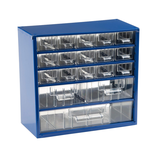 Kvalitné a odolné skrinky Tokoz, ktoré nesmú chýbať ani vo Vašej dielni, sú vyrobené z oceľového plechu a opatrené odolným práškovým lakom Číre zásuvky a prepážky sú vyrobené z trvanlivého materiálu PS 15 malých (S), 2 stredné (M) a 1 veľká (L) zásuvka Šírka: 306 mm Výška: 282 mm Hĺbka rámu: 145 mm Hĺbka vrátane presahu zásuviek: 155 mm Farba: modrá RAL 5002