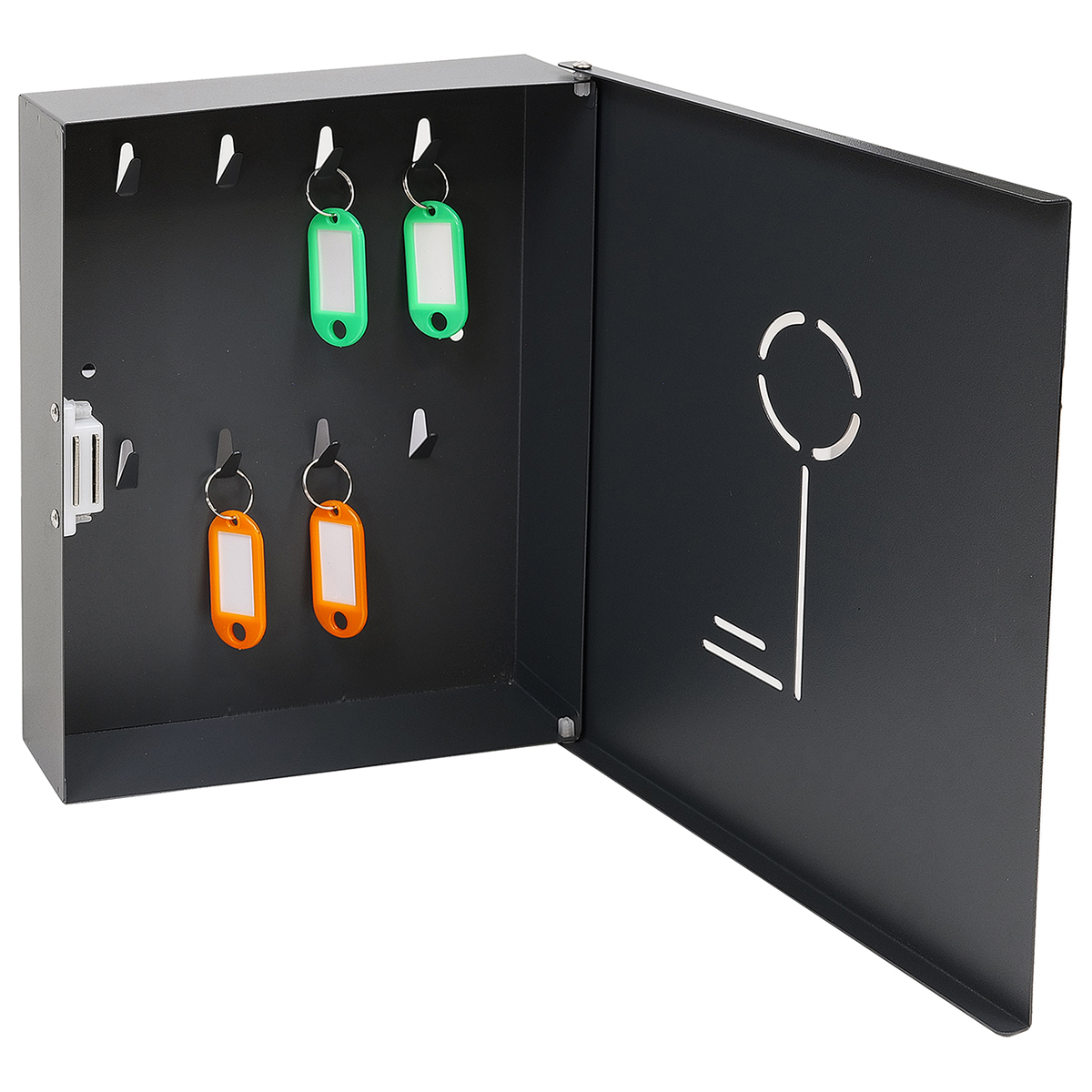 Oceľová skrinka na kľúče so zatváraním na magnet Obsahuje farebné menovky s krúžkom na kľúče Počet hákov (menoviek): 8