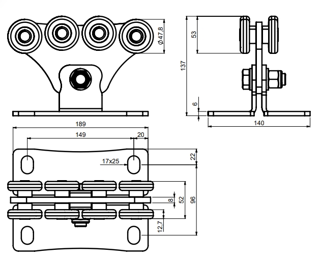 Symetrický vozík SE je ekonomickou verziou vozíka S a je určený pre klasické samonosné brány montované na rovnom teréne Maximálna priechodzia šírka brány je 4,0m a maximálna nosnosť je 325kg