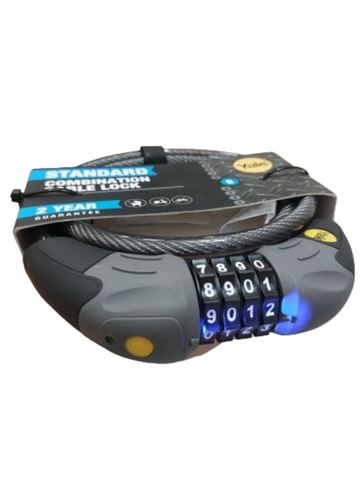 Yale lankový zámok s podsvieteným štvorčíselným kódom (až 10 000 kombinácií), ktorý je možné meniť Je určený na zamykanie kolies bicyklov, motoriek a iného Zámok má kombinovaný systém s oceľovými guličkami a kryt je z hytrelu Pletené oceľové lanko s priesvitnou vinylovou ochranou Dĺžka: 1800mm Priemer lanka: 10mm