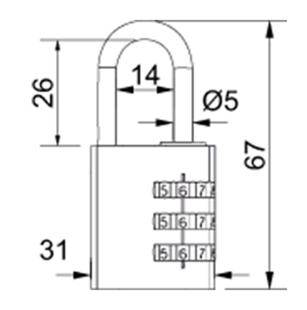 Rozmery zámku: Šírka tela zámku: 30mm Výška tela zámku: 31mm Hrúbka tela zámku: 13mm Celková výška zámku: 67mm Priemer oblúku: 5mm Výška otvoru v oblúku: 26mm Šírka otvoru v oblúku: 14mm