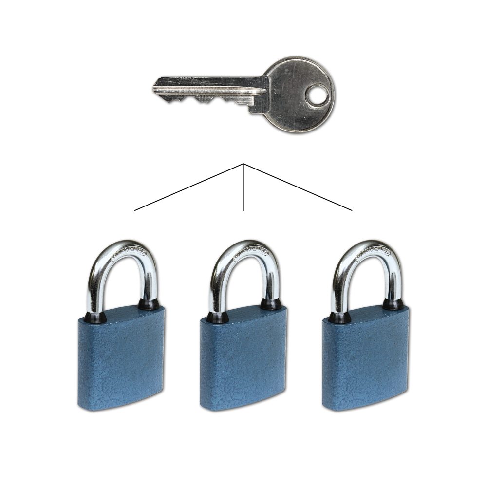 Set 3 ks visiacich zámkov na spoločný kľúč - jedným kľúčom otvoríte všetky zámky zo setu Balenie obsahuje 3 ks zámkov 38mm a 6 ks kľúčov Telo zámku je zo zliatiny Strmeň je z kalenej uhlíkovej ocele - HARDENED a je istený v dvoch bodoch Na každom zámku sú 2 ks gumových krúžkov, ktoré chránia zámok pred prienikom vody Zamykanie zámku bez kľúča - len zatlačením strmeňu Vložka zámku obsahuje 5 ks odpružených stavítok Povrchová úprava: modrý komaxit