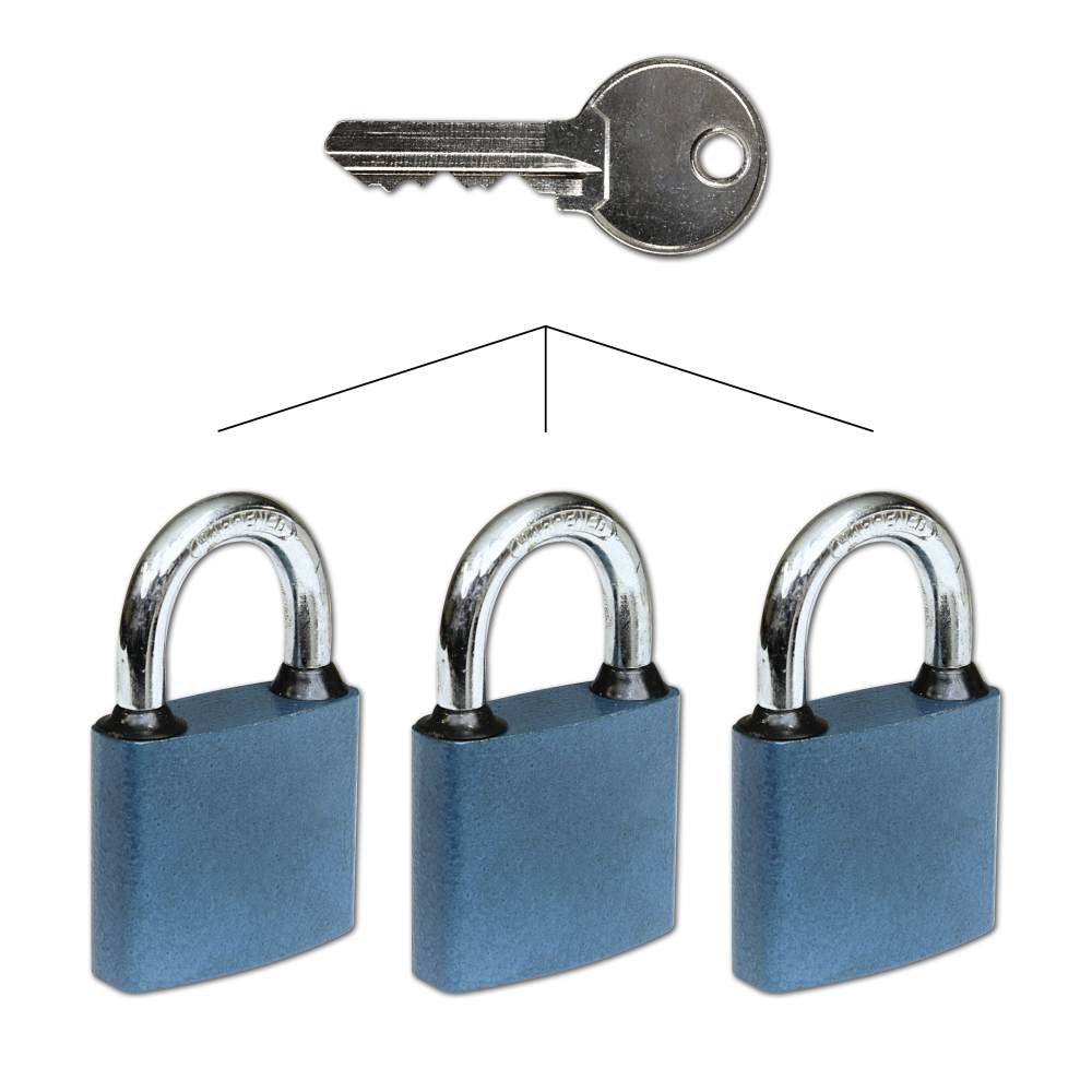 Set 3 ks visiacich zámkov na spoločný kľúč - jedným kľúčom otvoríte všetky zámky zo setu Balenie obsahuje 3 ks zámkov 52mm a 6 ks kľúčov Telo zámku je zo zliatiny Strmeň je z kalenej uhlíkovej ocele - HARDENED a je istený v dvoch bodoch Na každom zámku sú 2 ks gumových krúžkov, ktoré chránia zámok pred prienikom vody Zamykanie zámku bez kľúča - len zatlačením strmeňu Vložka zámku obsahuje 5 ks odpružených stavítok Povrchová úprava: modrý komaxit