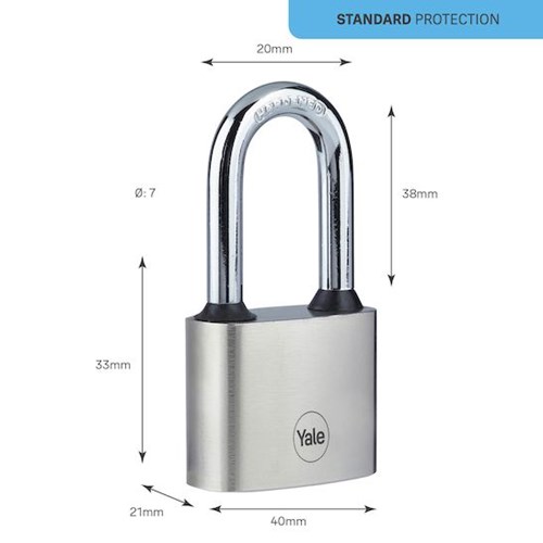 Visiaci zámok diskový, s predĺženým strmeňom Rozmery: Šírka - 40mm, Výška: 70mm, Priemer strmeňa: 7mm Kalený oceľový strmeň zabraňuje prerezaniu Testované podľa EN12320:2012 pre rôzne formy útoku, ako je rezanie, krútenie a ťahanie Odolný zámok, testovaný na 10 000 cyklov Odolný voči poveternostným vplyvom. Vhodný pre sklad, garáž, záhradu. Gumové krúžky chránia telo proti prienikom vody Pri otvorenom zámku sa nedá vybrať kľúč Uzamknutie zatlačením do zámku bez použitia kľúča nie je možné Dodávané s 3 kľúčmi