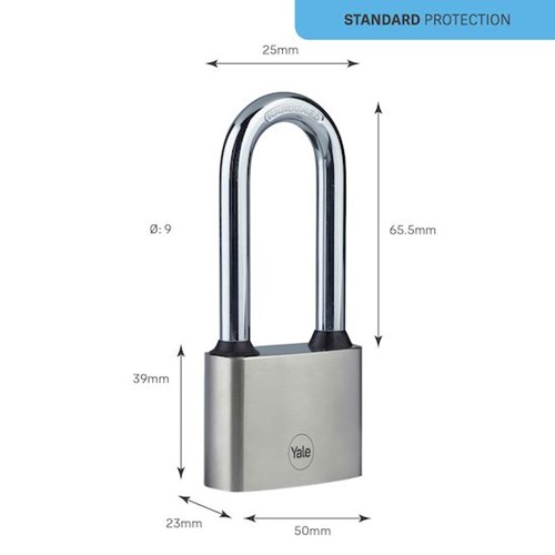 Visiaci zámok diskový, s predĺženým strmeňom Rozmery: Šírka - 50mm, Výška: 115mm, Priemer strmeňa: 9mm Kalený oceľový strmeň zabraňuje prerezaniu Testované podľa EN12320:2012 pre rôzne formy útoku, ako je rezanie, krútenie a ťahanie Odolný zámok, testovaný na 10 000 cyklov Odolný voči poveternostným vplyvom. Vhodný pre sklad, garáž, záhradu. Gumové krúžky chránia telo proti prienikom vody Pri otvorenom zámku sa nedá vybrať kľúč Uzamknutie zatlačením do zámku bez použitia kľúča nie je možné Dodávané s 3 kľúčmi