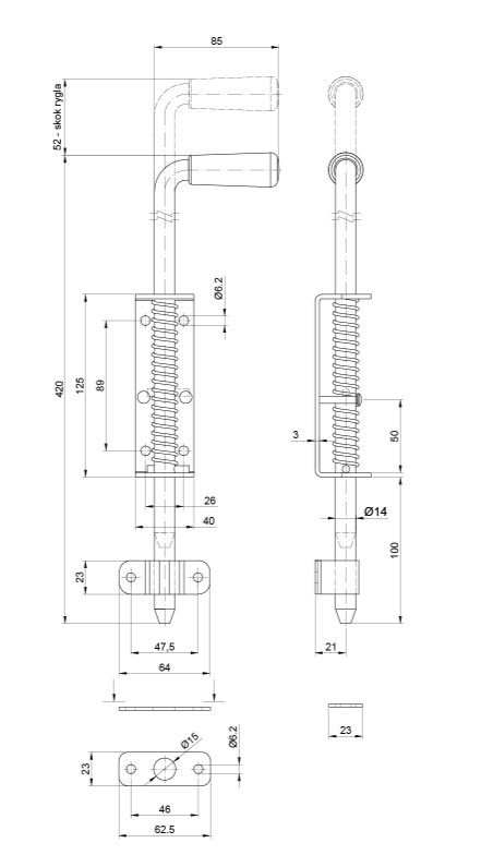 Rígeľ/zástrč naváracia o 14mm, L: 420mm, pozinkovaná s pružinou