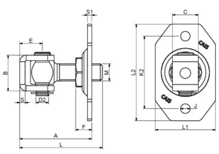 Záves regulovateľný s platničkou pre murované a kovové stĺpy Rozmery podľa technického nákresu z obrázka: M - M16, L1 - 56mm, L2 - 90mm, A min/max - 50/77mm, L - 77mm, B - 33mm, C - 24mm, D2 - 12mm, E - 21mm, F - 16mm, J - 9mm, K2 - 68mm, S - 5mm, S1 - 4mm
