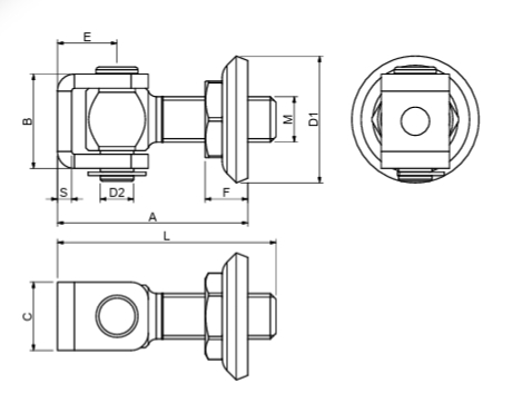 Záves nastaviteľný s maticou a podložkou pre kovové stĺpy Rozmery podľa technického nákresu z obrázka: M - M20, A min/max - 60/88, L - 88mm, B - 39mm, C - 28mm, D1 - 50mm, D2 - 14mm, E - 25mm, F - 19mm, S - 6mm