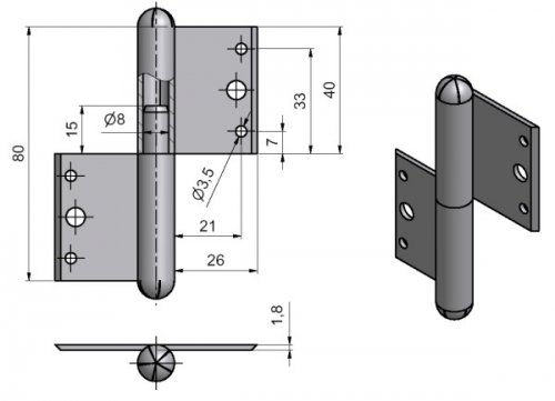 Kompletný okenný záves s dĺžkou 80mm pre ľavé okno (rám) Slúži na otočné spojenie okenného krídla s rámom Bez povrchovej úpravy Nosnosť 1ks: 10kg